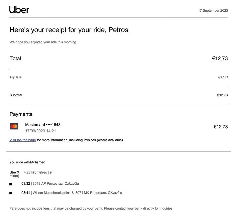 I demand compensation for my Uber ride (12.73 euro) and also compensation due to the ridiculously long waiting time and tiredness.