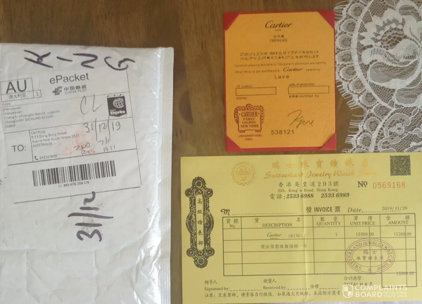 I received the fake Cartier ring, haven't been ill by the way, but on chasing a supplier for 3M memo boards they gave me tracking and the tracking is for the parcel with the ring in it. I ordered the memo boards through a UK site but obviously the order and payment went to China. Now asking them what they are playing at.