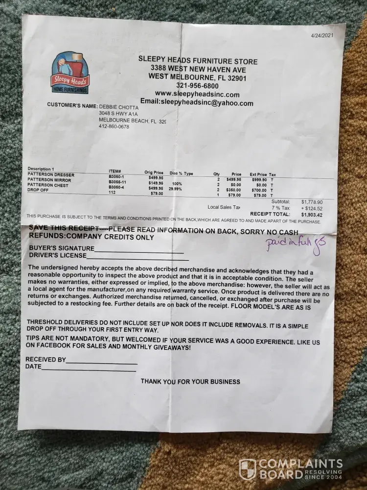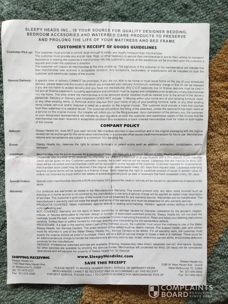 Before signing my wife was told that the store would provide a full refund if we decided not to buy it. That conversation and the one the following day when I was there, was extensive. We had a different furniture store (Furniture Now) refuse to refund our money when we tried to cancel a couple hours after the salesman asked us to sign THEIR document a few days before. The sales rep at Sleepy Heads talked about The owner of that store, and his son that took over being sleezy. She said that Sleepy Heads was a very reputable family owned business and "would never do something like that." But thats exactly what happened. The owner of Sleepy Heads refused to cancel the transaction. We told him what his sales person told us but he said that it never happened. He then claimed to have a video of our discussion but refused to show us. We assume because he was lying because we had an extensive conversation about it with the sales person. And a video would prove that if he really had one. But he refused to share the video with is because he said that "he didnt have to." I told him that I would have my credit card company dispute the unauthorized charge. He said "go ahead. I have a signed document."