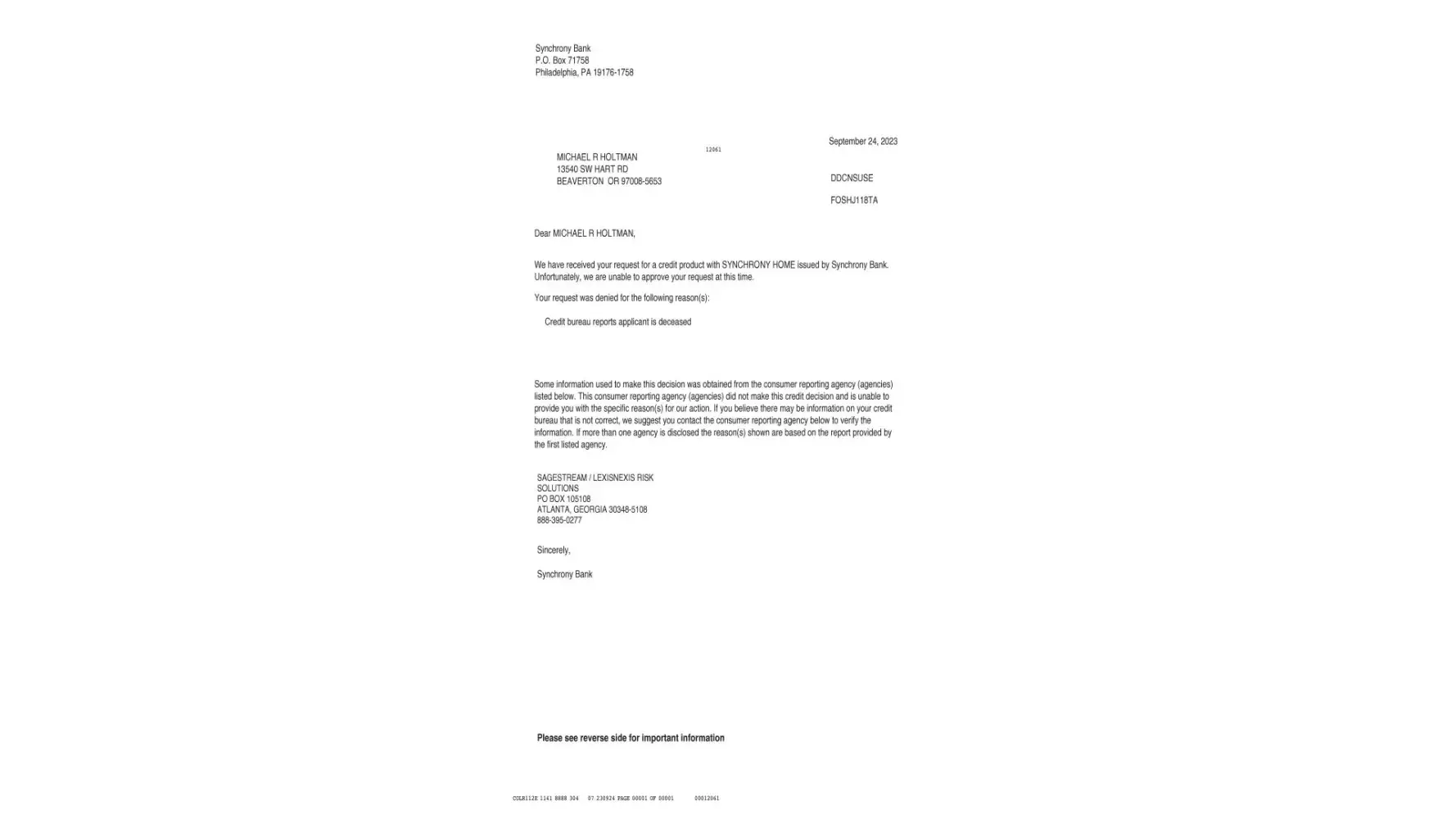 On September 20, 2023, Customs NW Remodeling sent me a link for Synchrony Bank to apply for a loan. The loan in my husband's name was denied due to the applicant being DECEASED. The denial email was received on September 25, 2023. My husband is NOT dead. My concern is that having this "out there" may cause us problems in the future. I contacted our bank, Custom NW Remodeling, our credit report, Social Security and all three Credit Bureaus.