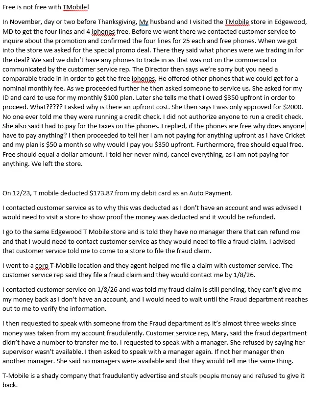 Nov, I visited the TMobile store in Edgewood, Md. Nothing was finalized. I told them to cancel everything when I was told the 4 lines and 4 Free Iphones were not free, and I had to pay money upfront. On 12/23/25, I noticed money was taken from my debit card. I opened a fraud claim and still have not received my money back. Please see uploaded docs.