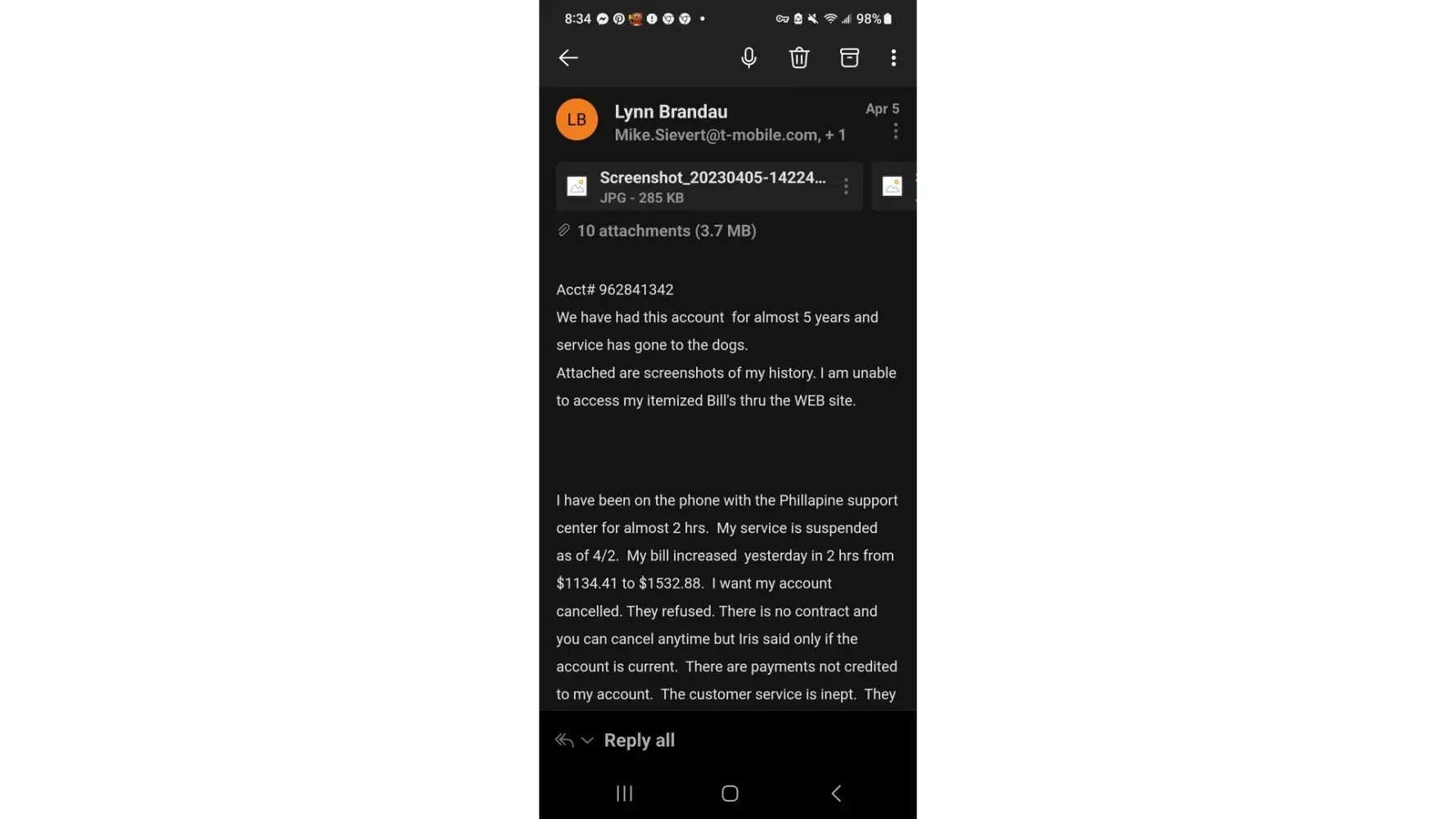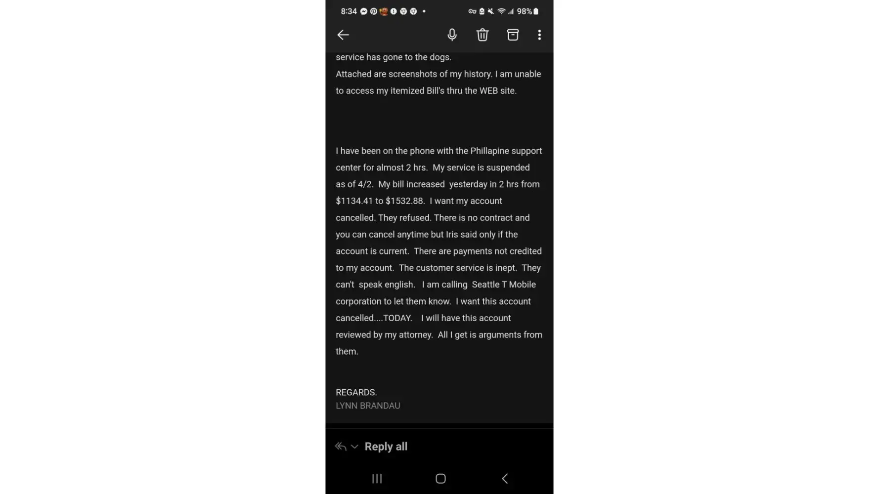 I have been on the phone with the Phillapine support center for almost 2 hrs. My service is suspended as of 4/2. My bill increased yesterday in 2 hrs from $1134.41 to $1532.88. I want my account cancelled. They refused. There is no contract and you can cancel anytime but Iris said only if the account is current. There are payments not credited to my account. The customer service is inept. They can't speak english. I am calling Seattle T Mobile corporation to let them know. I want this account cancelled... TODAY. I will have this account reviewed by my attorney. All I get is arguments from them.
