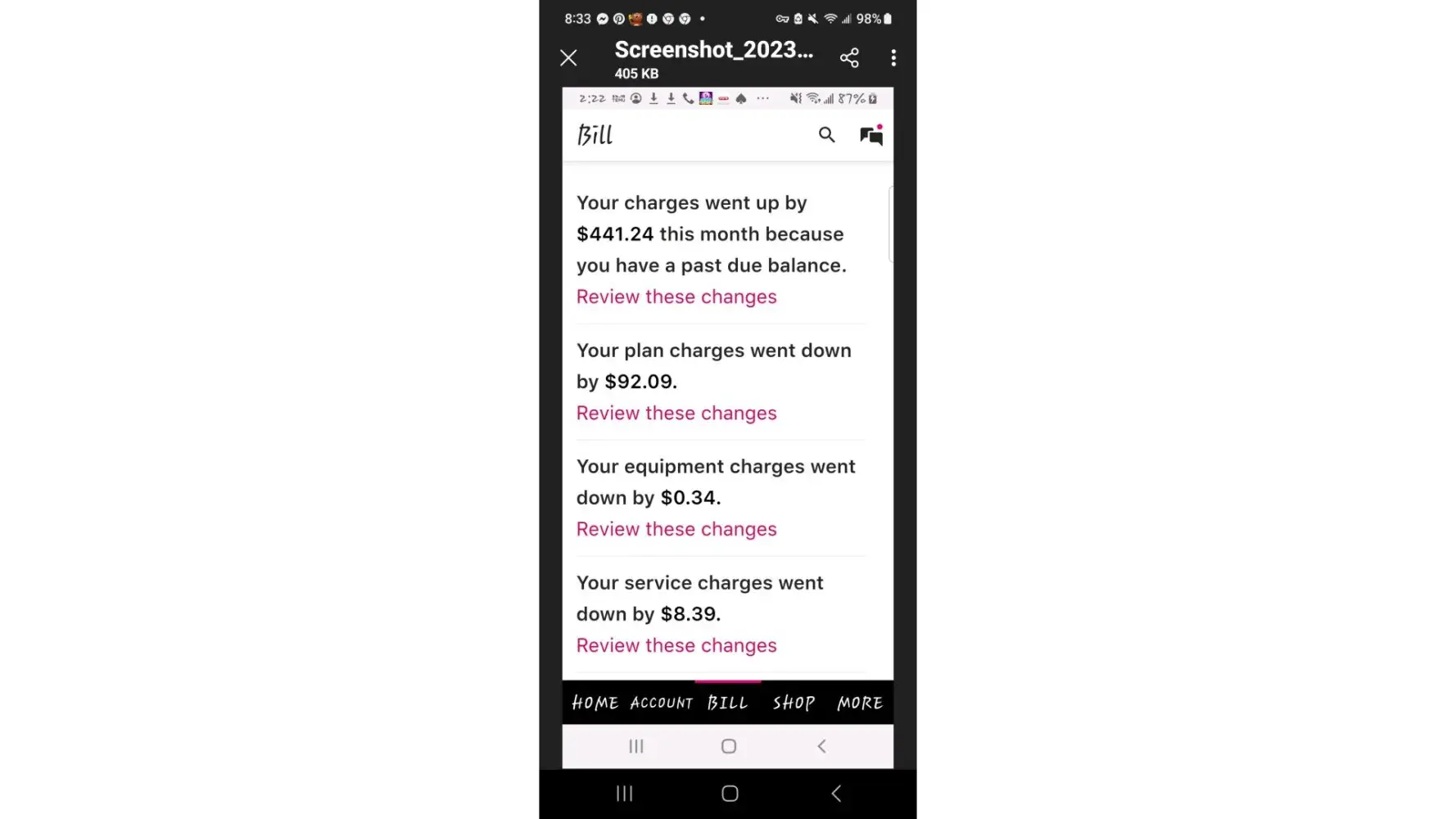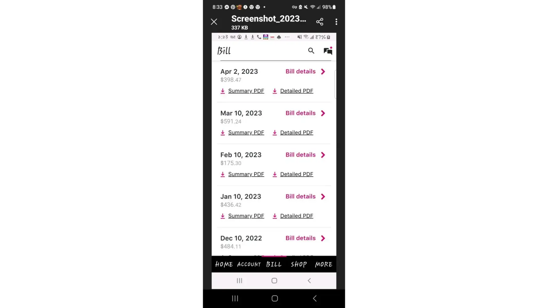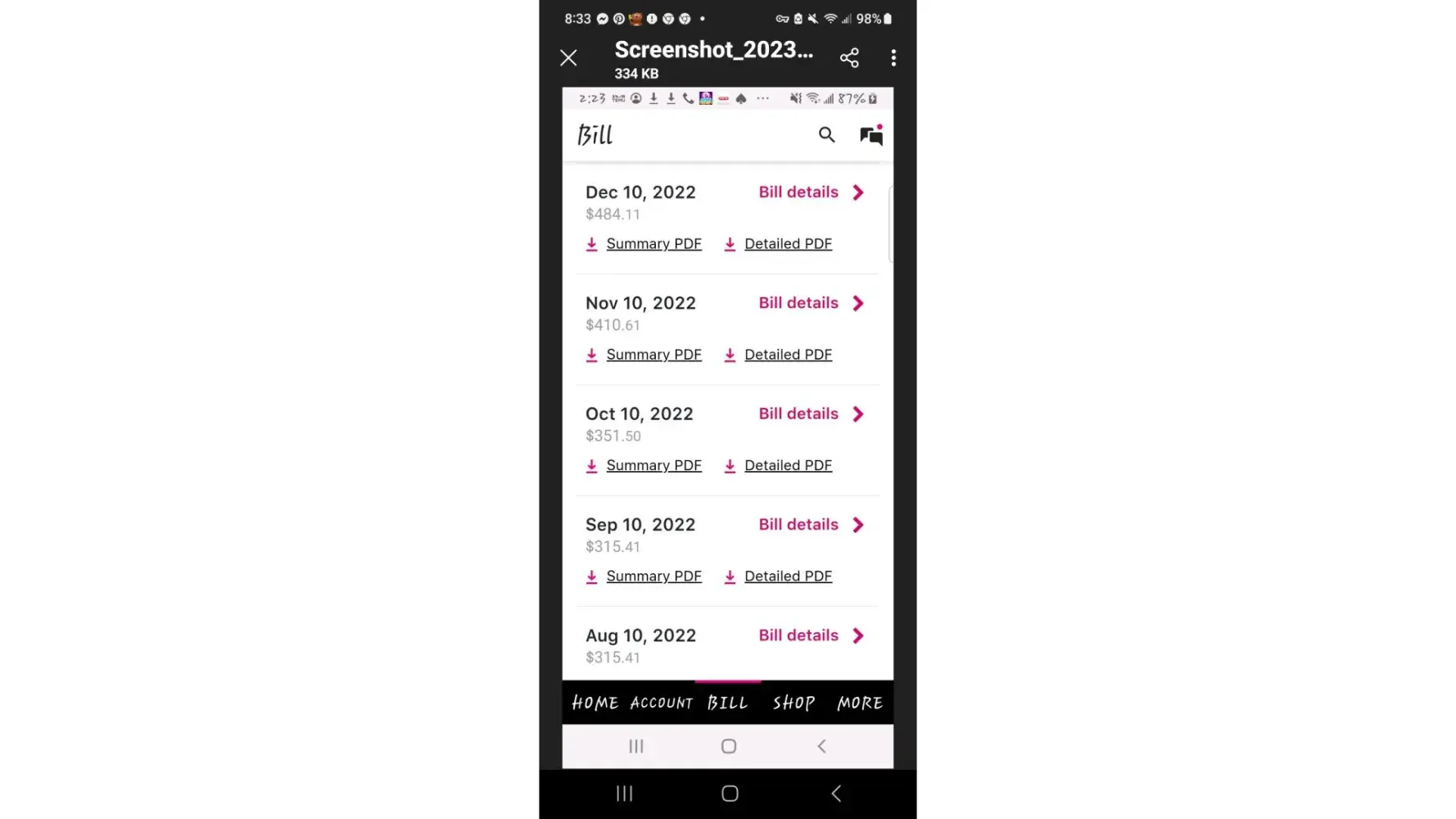 Attached are screenshots of my history. I am unable to access my itemized Bill's thru the WEB site.