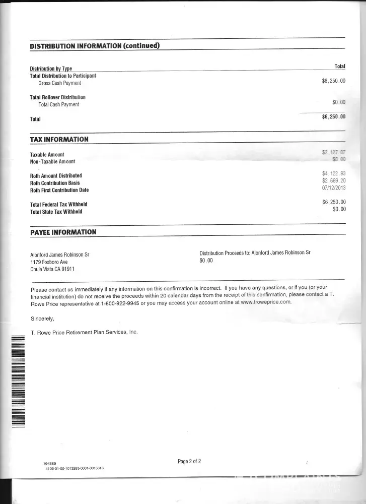 Never put money With T.Rowe Price. You Will never get it bac! This is such a true statement. I asked for a roll over that was to take 7-10 business days. It took 6 weeks. I asked to just have the check sent to me. This was an issue, they never processed that request, another 7 days. Then I asked for a distribution, they could not do that either. Their only solution is for me to open a new IRA account with them, and leave my money with them. FDIC next!