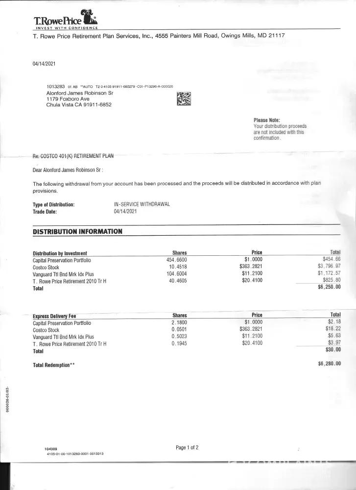In November of 2017, my close friend Linda West passed away. She had sent to me a copy of her notarized California Statuatory will naming me beneficiary to all her financial holdings, among which was a T. Rowe Price 401 K. I notified T. Rowe Price of her death and supplied a copy of the statuatory will and the death certificate from Butte County, California. T. Rowe stated they could not transfer funds into my name as Linda had not filed their beneficiary form and that only a letter of testamentary would qualify to have the funds transferred into my name, or liquidated and sent to me. I contacted two legal firms who charged me to apply for the funds with forms they said would initiate the transfer, nor would they provide any information about the account or its balance. The two law forms also informed me that if the estate were under $150,000. no letter of testamentary would be required in California. T.Rowe would not accept those forms nor that information. As an option, I opened probate in Butte County and was named executor and sent those forms to T. Rowe. Again, with no response. I contacted the Butte County Courthouse and was informed that the California courts do not issue letters of testamentary. I was referred to the California Law Library in Sacramento to obtain the correct forms to file for transfer of ownership. I filled those out and again sent a copy of the death certificate. This was months ago and I have still not heard anything from T. Rowe. It is five years later, and I have spent over $3,000 to settle this issue all to no avail.