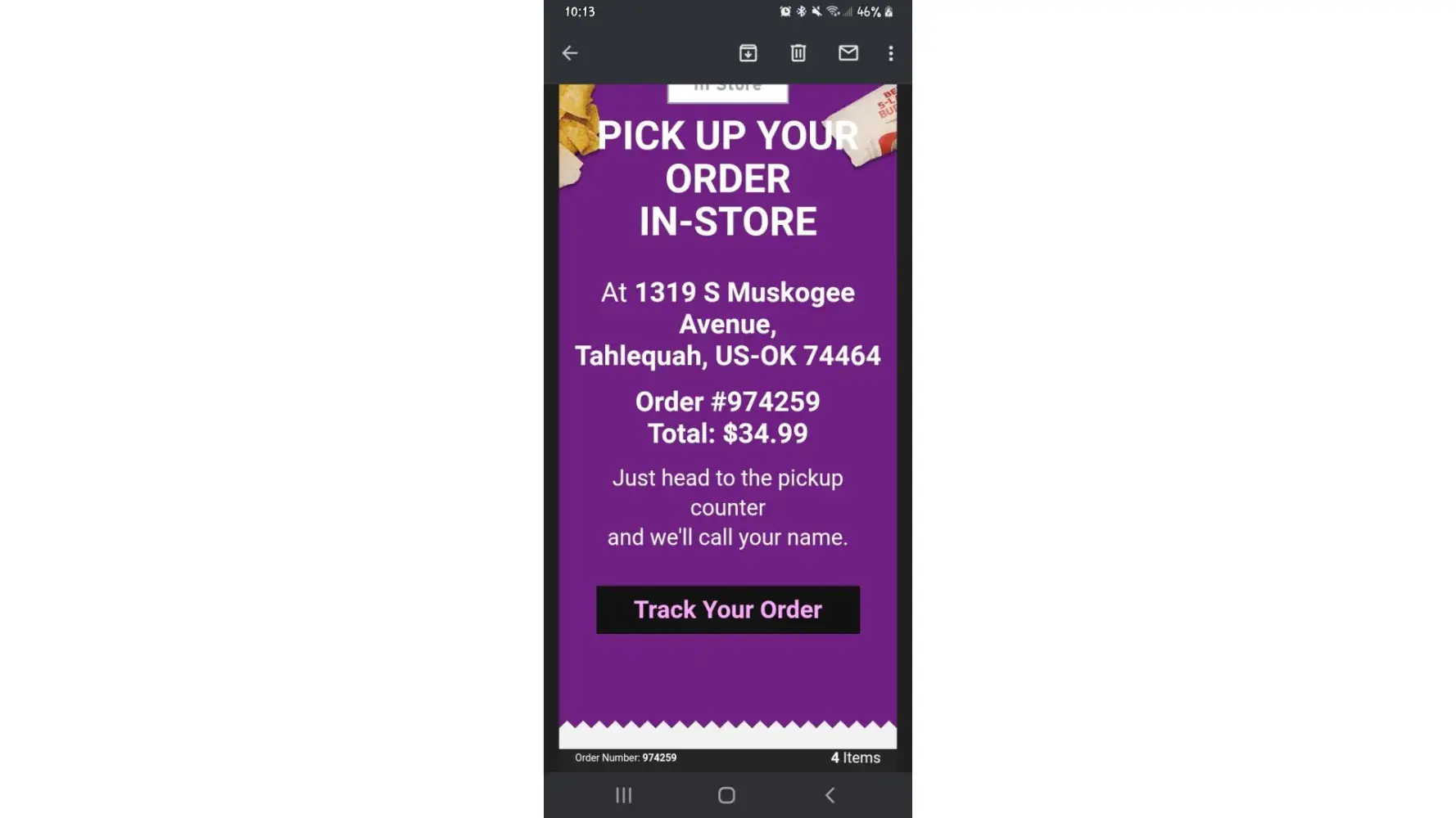 So April 5th I ordered taco bell on app, total was 34.99. But when I went to picked up order, they said the app isn't connected to Tahlequah taco bell and they never got any order from me. Even tho I can send u my online receipt that clearly shows I was charged for food I never got. I need a refund in a timely manner, can you help with this please. Oder number is 974259. I'm having so much trouble just finding someone to help me get my money back since I was never given my food I ordered. I have the emailed receipt,I have proof of the unfortunate mishap and jus would like my money sent back to my account