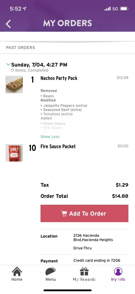 I order a nacho party pack.. I pay for extra jalapeños and extra tomato.. and extra season beef.. I got nothing extra. No JALAPEÑOS at ALL! I don't know how to eat something that doesn't have the flavoring I want. It is July 4th.. I have no time to go back to the store to complain.. I am very surprised they don't check the order before giving it to us..