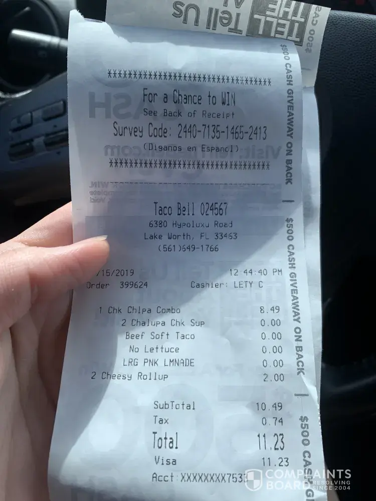 I ordered a Crunchwrap combo. The Crunchwrap was old and not cooked. Tasted moldy. I have eaten them before and as soon as I tasted it it left a nasty taste in my mouth. Maybe a tablespoon of meat and a lot of lettuce. Was at work so was not able to return. I also ordered a lemonade, told me the machine was down. When I got to the window there was a...