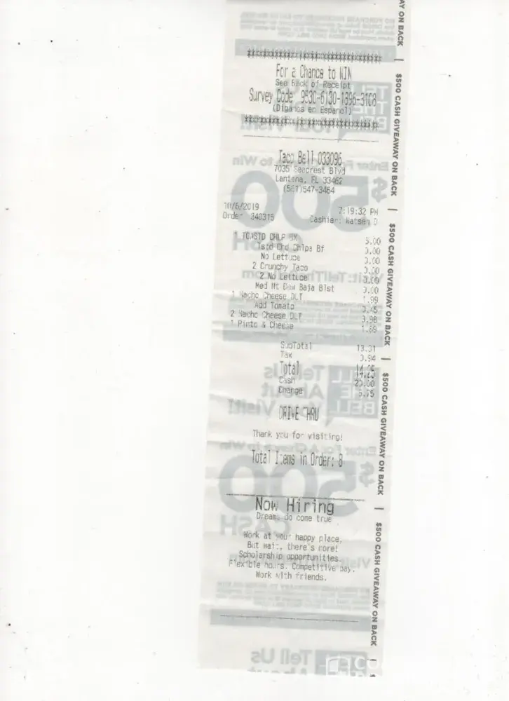 Sunday, October 6 at 7 pm I went through the drive thru window and was given all my items in one bag, i had ordered a chalupa box but there were not boxes so everything was placed together in a bag along with the rest of my order. I was told to hold on there was 1 more item, then the guy came back to the window and told me everything was in the bag so i...