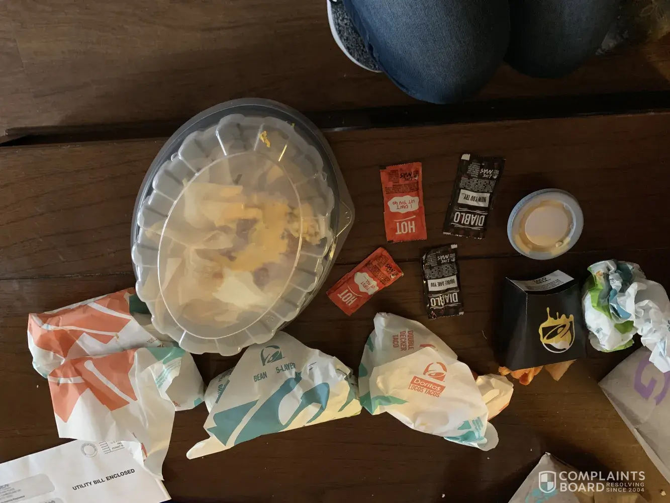 I simply ordered 6 tacos and nacho fries and I got my fries that were horribly soggy like they were made 5 hours before hand and were just sitting there and I asked for no tomatoes or sour cream on my tacos and they still had sour cream it was just horrible. Why does Taco Bell act like they can just give people old food like it's nothing it's disgusting and needs to be more sanitary, throw away the fries after an hour if no one eats them not give them out to customers. I just threw away my whole meal
