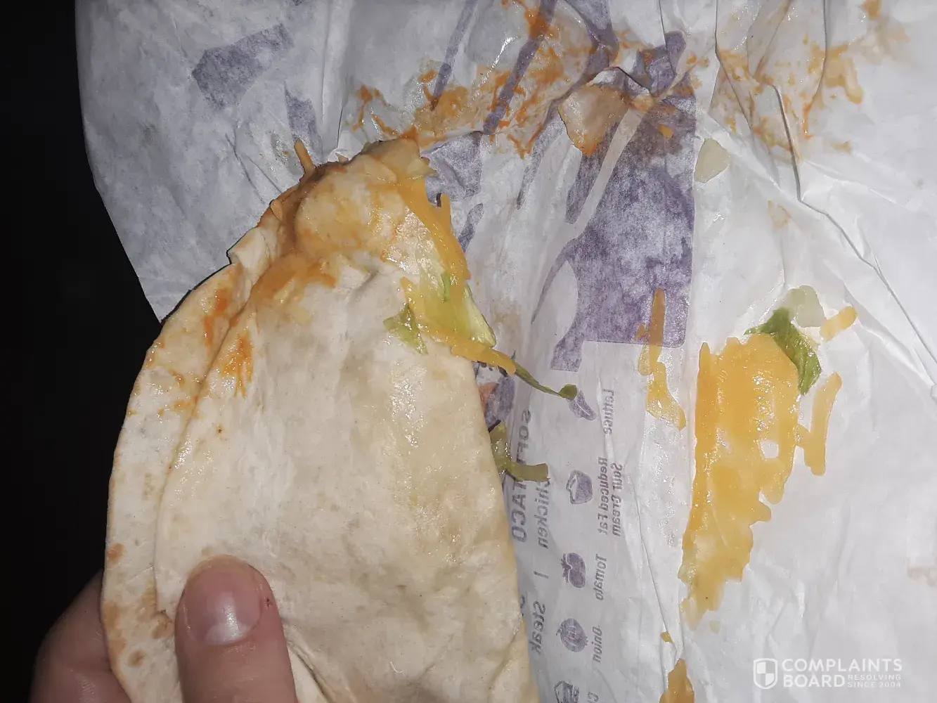 They told my fiance when he asked for a chalupa supreme they only do steak and chicken which is a LIE, cause I always get it with beef. The dorito taco was completely soggy and cold in the middle, just fell apart in my hand. The 4 SOFT tacos which you see in photo were also somewhat cold and the edges of the tacos were dried up and the whole wrapper is filled with meat grease and melted cheese that when taking the taco off the wrapper the wrapper came with it. We didnt even get the quesadilla they gave us 2 [censored]ing steak chalupa supremes. The only thing they got right was the grilled steak soft taco. My fiance even had to turn around and go back because they forgot the nacho cheese they CHARGED me for. Now it only takes about 15 mins to get home from taco bell, my food should NOT be that cold already. I called the store 3 times now, and got no answer from them. Sad to say I love Taco Bell but I will NOT be returning for a long while. Just basically insult to injury on this already horrible [censored]ing day I been having.