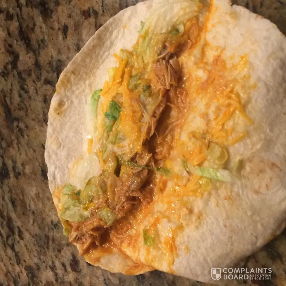 These tacos were what I consider to be a chicken canned dog food, looks and smells the same as what I give my dogs. Actually their dog food looks more appetizing! This stuff in these tacos was a disgusting smear of soft,