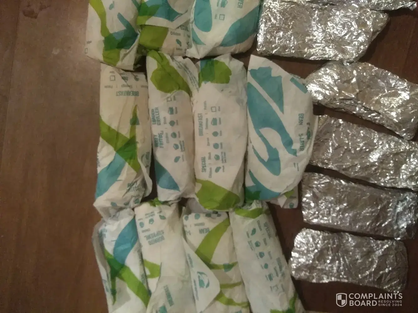 We get home with it and EVERYTHING IS WRAPPED IN THE SAME WRAPPER NOTHING IS LABELED IT TOOK US 20 MIN TO UNROLL ALL THOSE BURRITOS ONE BY ONE TO FIGURE OUT WHAT WAS WHAT THIS IS EVERY TIME WE GO TO TACO BELL THIS IS GETTING RIDICULOUS ... IT WILL BE A WHILE BEFORE WE RETURN