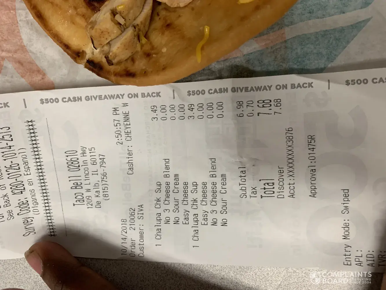 Every time I order a chicken chalupa I ask them to replace the triple cheese with cheddar cheese and ‘no sour cream', as I am lactose intolerant . Until now, I used to order a ‘to go' and as soon as I reach my home to open the food, I see only triple cheese and chicken in my chicken chalupas, and nothing else (no tomato's and no lettuce). When I order a dine in I get everything I want. But, when I order a to go, I get fooled by the employees. I'm a lactose intolerant person and I can eat only cheddar cheese so I ask for it. Why the hell do they mess with my stomach when I'm paying for my food? This has happened more than 4 times to me now. I'm fed up of it. Why do I have to pay 7.68$ every time I ask for a chalupa and I get nothing except for cheese and chicken in my chalupa. Once, I only got cheese and no chicken in my chalupa. What the hell is wrong with those guys? Today October 14, 2018 I ordered a to go for ‘two chicken chalupas, no triple cheese and no sour cream and asked them to replace the triple cheese with cheddar cheese'. Well, as soon as I reached my place to open it, I got the chicken chalupa with chicken and cheddar cheese all right but I didn't get either tomatos or lettuce in my chalupas. I took pictures of this . One of my chalupas had very little cheddar cheese and chicken with nothing else in it, while the other had tomato's and less chicken with cheddar cheese. My point of complaining today is I'm fed up with taco bell fooling me every time I order a to go. I don't want to pay 7.68$ when I get food that's not even worth 3$. I don't care anymore. I didn't even post negative reviews on taco bell or any other food chain company until now. I hope you understand my frustration.