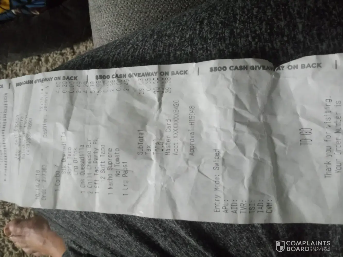 My husband and i went to taco bell on 10/11/2018 in Greenville Ms order # 029603 @ 7:05pm.