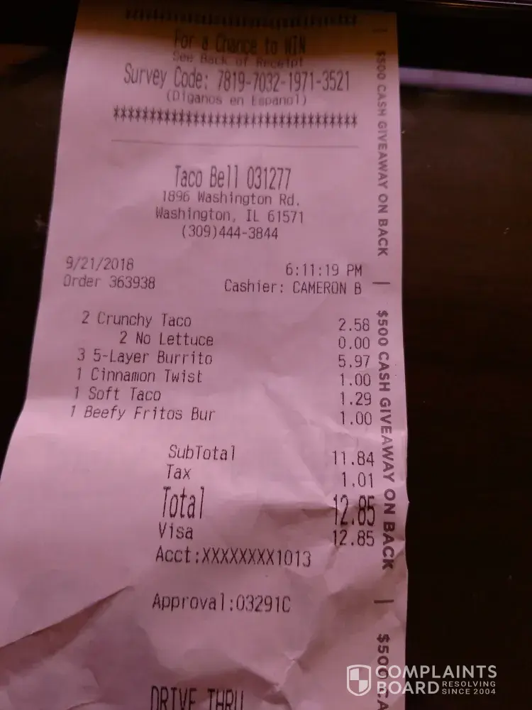 So one needs to check the receipt and make sure that the numbers match up or one may find that he/she has been robbed. It is only $5.00 but Taco Bell employees or any fast food drive thru employees may be indiscriminately robbing customers. If I was paying attention when I was still at the drive-thru window I may have been able to call him out on it.