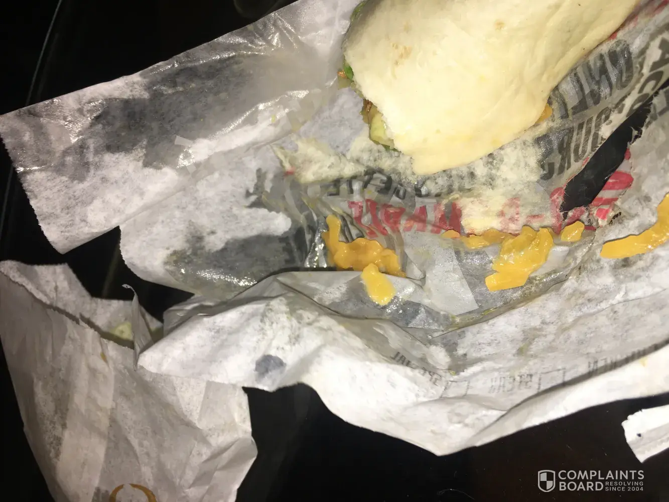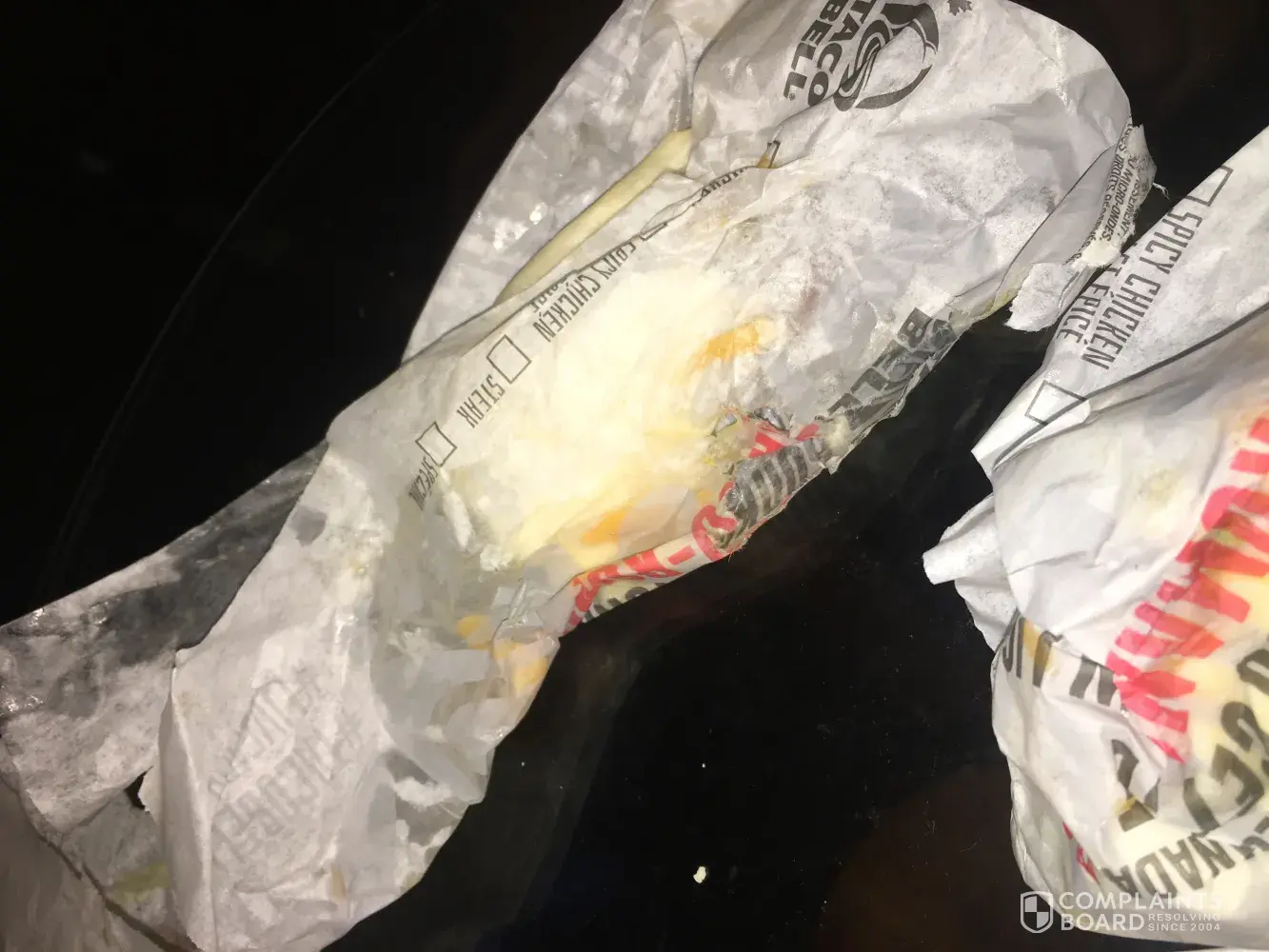 I went through the drive thru and ordered 2 shredded chicken hard shell tacos as I normally do. They're usually delicious and the chicken is always great. However, I went through the drivethru tonight and have no idea what in the world I received. First of all, as soon as I opened the first taco the smell coming out of it was HORRIBLE. I immediately knew something was not right... I didn't know what hit me. I opened the taco and saw BLACK chicken and pulled it out and this is what I got. Absolutely disgusting. In both tacos. I don't even know if this is chicken. I have never seen or smelled anything like it.