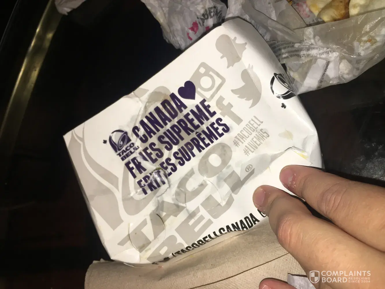 Last experience at the Huron church Windsor Ontario location was horrible. The tacos were soaked and they were not very busy.. we had a big order and the messed up the dorito and gave us a just tacos. But besides that everything was soaked ! The fry surpreme box was even soaked and fell apart. Then the soft tacos were soaked we couldn't eat them . Everything was soggy and gross ! It was also night time so they were closing and I didn't realize until I was home which is far away from that taco bell