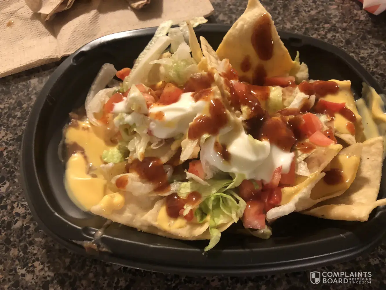 I purchased the taco salad like I oftend due. The shell tastes like soap. This was a waste of my money. I ate the everything except the shell so that I could at reduce the amount of waste I created. I order that taco salad at least once a week and have never had this problem but I don't know if it was soap or a chemical that had been sprayed onto my shell. This should be investigated by the company. I would hate to find out that we are eating posion because employees are spraying chemicals around our food.