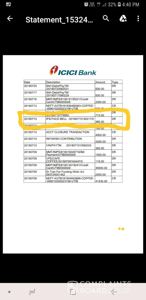 The reason I am complaining is that I have got food poisoning from the food consumed and needed hospitalization the next day. I have the statement of the purchase at taco bell in my bank statement.