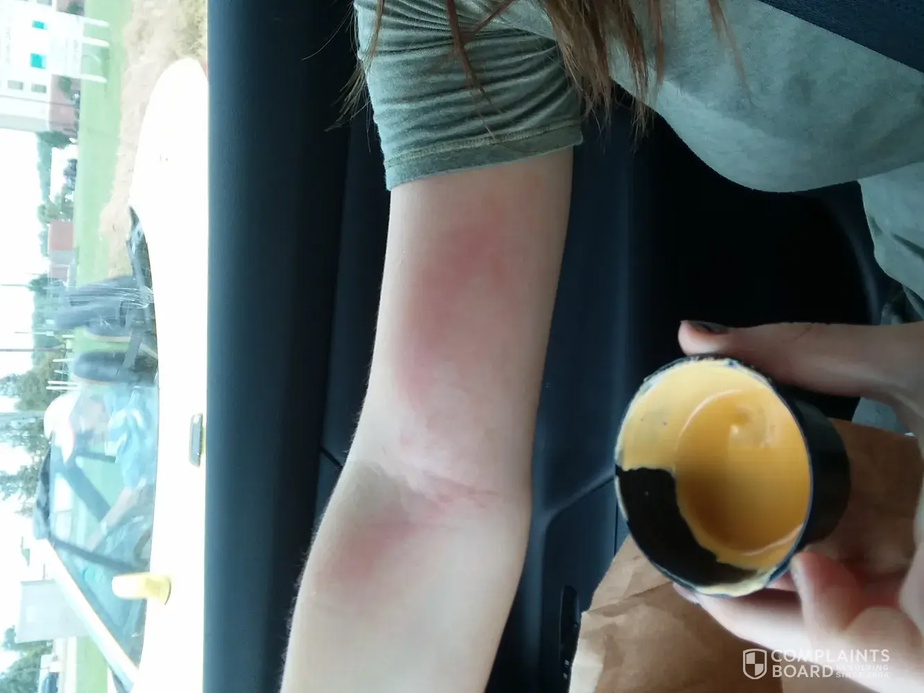 Yesterday I bought my daughter an order of nacho fries at the drive through in Jennings Louisiana. When we drove off she spilled the cheese on her arm. It was so extremely hot she suffered a bad burn. I pulled the car over to help her because she was crying and screaming in pain. When I took the container from her even the container was hot. The container was too flimsy for a product that hot. The cheese was way too hot to serve to the public in an unmarked flimsy container. This product is not safe! I brought her to the doctor today for the burn. I have pictures of her burns.