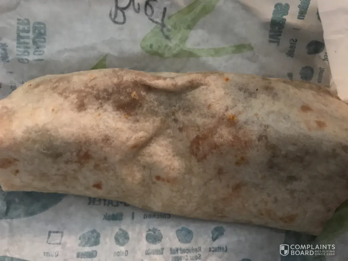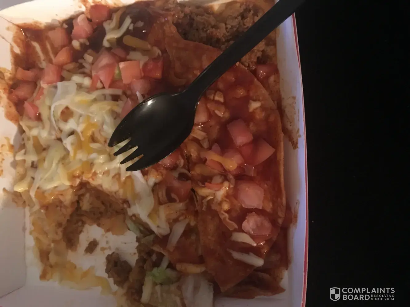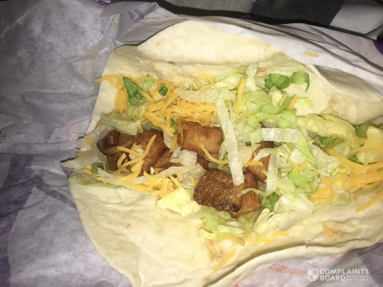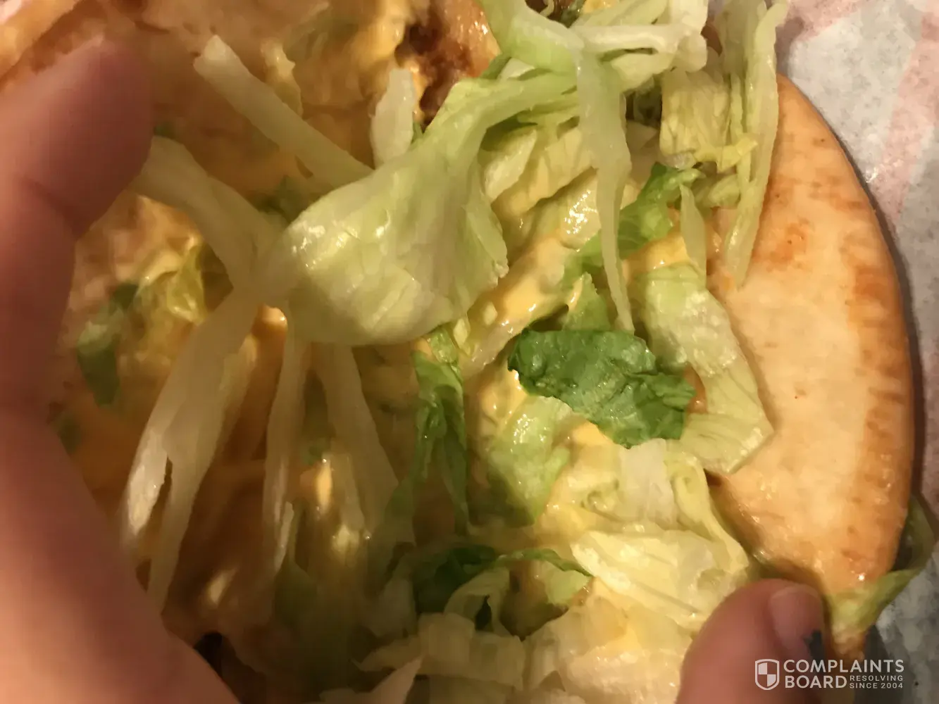 As soon as removed from foil. It spilled all over my business clothes. Dripping with sauce and grease. I managed to get water from the front counter and a rag. Horrible wrapped. No care involved ... Taco Bell 033461 8:23 pm. Balboa blvd. 2121 ... longnlines. They just threw the food together . The guy who had a bag in his hands only had one glove on ... never changed it ! Gross ...