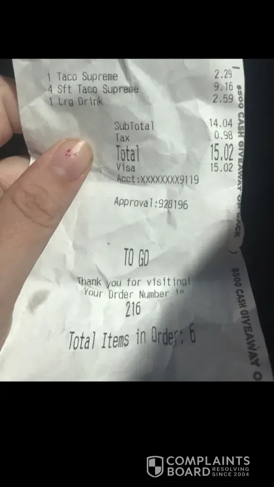 For some odd reason, my order is wrong just about every time I go there. Orders are usually basic and easy for their employees to comprehend, but they just can't get it right. And it's not just me either. It's my wife, my kids, friends, neighbors...pretty much everyone I know has had an issue with this particular Taco Bell. I've called to complain several times(not as much as I should have) and the managers are usually snippy and confrontational. Then they say, "let us know next time you come through and we'll make up for it". Bad thing is that the food is always bad when I go back. A taco doesn't consist of a little meat, two strings of cheese, and a piece of lettuce. Really guys, your company has reached an all time low in my book. My family and I have decided to avoid Taco Bell permanently, due to the CONSTANT poor quality and service. I know others near me feel the same way. We have other mexican cuisine options nearby, that actually care what their customers are consuming. Could your company start giving applicants an IQ test before employment? That might help turn things around a bit...well maybe.