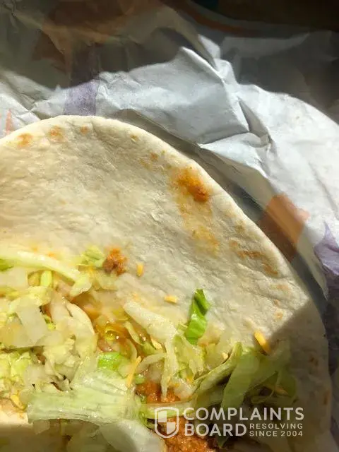 I purchased 2 soft taco supreme tacos with no cheese at the drive through on 5/13/18 at 1:38 p.m. Upon opening both tacos, water spilled out of them, they contained pieces of cheese (as if they had originally contained cheese and it had been picked out), and neither contained sour cream. Because of the excess liquid pouring from the tacos, the tortilla shells were soggy and slimy. I would like a refund in the amount of $4.13 or a voucher in the amount of $5 to make up for this terrible experience.