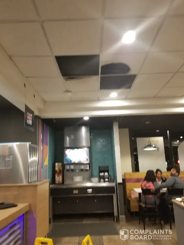 San Jose, CA 95128. I went to get some sauces when all of a sudden the ceiling tile cane off the roof. I realized that there was a leak & the tile became wet that ma why it fell off. If I was a little closer to where it fell I could have seriously gotten injured. Thank god there wasn't a kid because then he/she could have gotten a worst injury than me. Probably could have even slipped, they could at least clean up the mess instead of just leaving it a mess. Taco Bell fix your [censor] and prevent another [censor] accident like this.