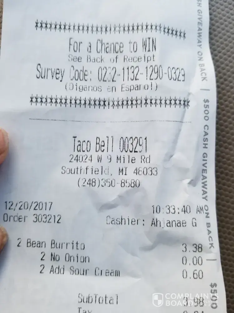 I went to Taco Bell today, 12/16/2017 to get some lunch. Went through the drive thru, the cashier got my order wrong on the screen and I tried to correct her. Pulled up to the window and asked her if she corrected it. With a rude attitude she said "yeah I got it". I got home with my food and it was still wrong. It looked like had just thrown it all together without any care. I ordered a taco and it was soggy and cold. My entire order was cold, like it had been sitting out for the last couple hours. I was to tired and did not want to waste my gas going to Taco Bell for them to fix a mistake they made. Store Number: 029144 Order Number: 343660 Cashier Name: Daira B