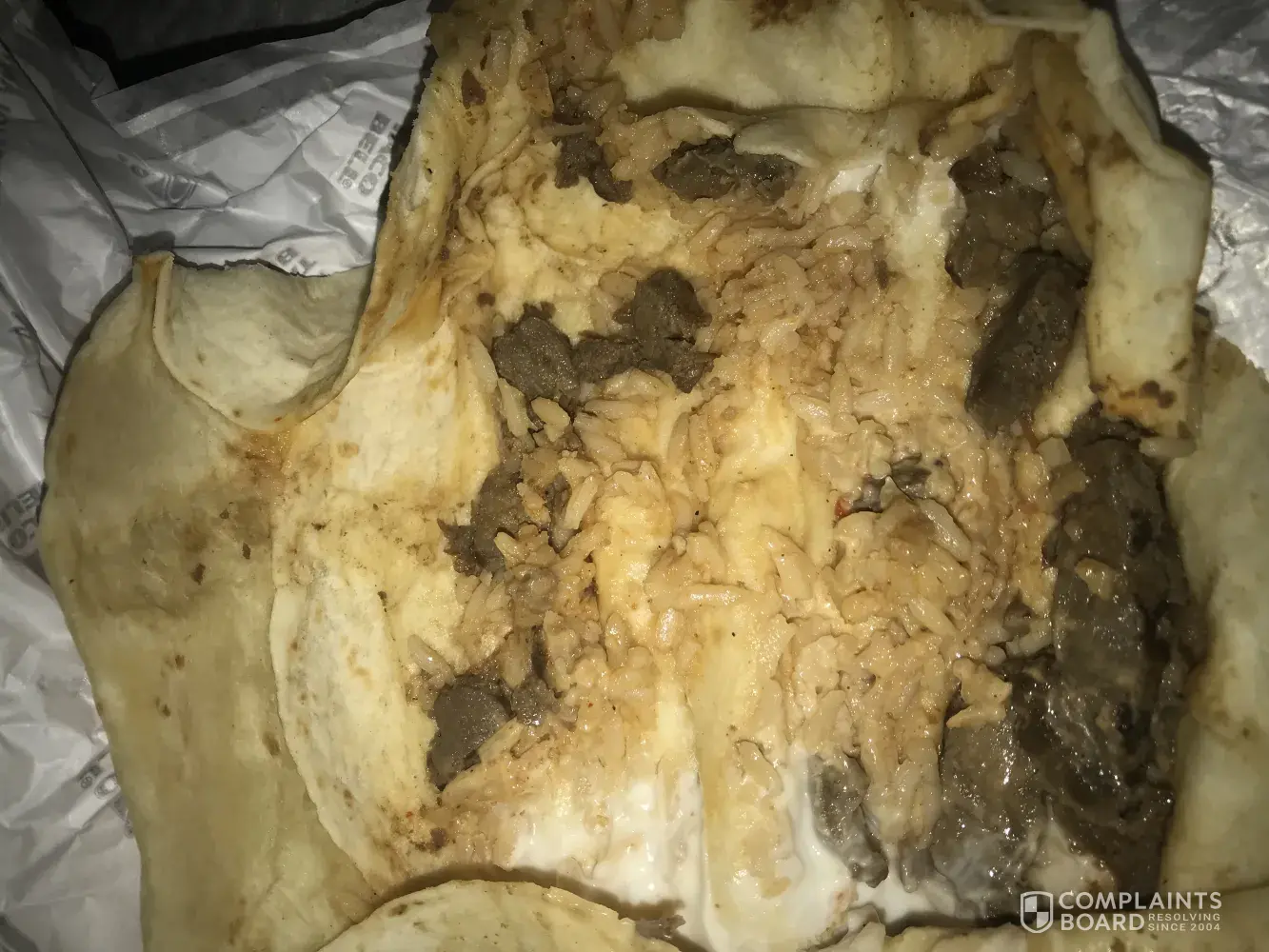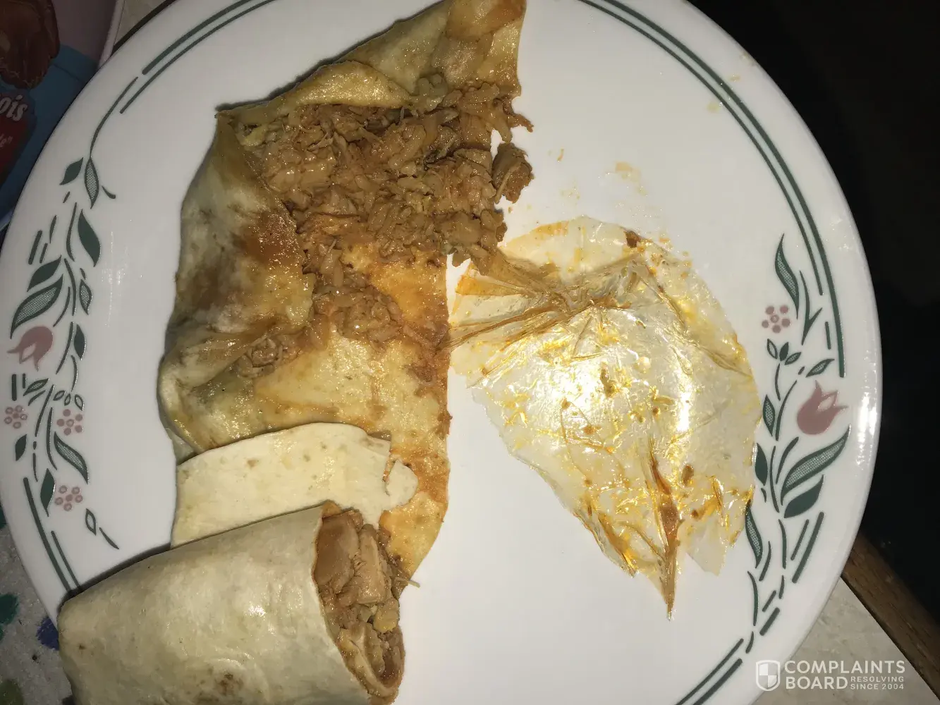 At approximately 12:30 pm on Thursday, September 21, 2017, we went through the taco bell drive thru located at 1818 Plainfield Rd, Crest Hill, 60403. One of the items I ordered was a chicken burrito. After getting home, I cut the burrito open to eat it & found a plastic wrapper inside. That is absolutely disgusting & unacceptable. I would like something to make up for this mishap.