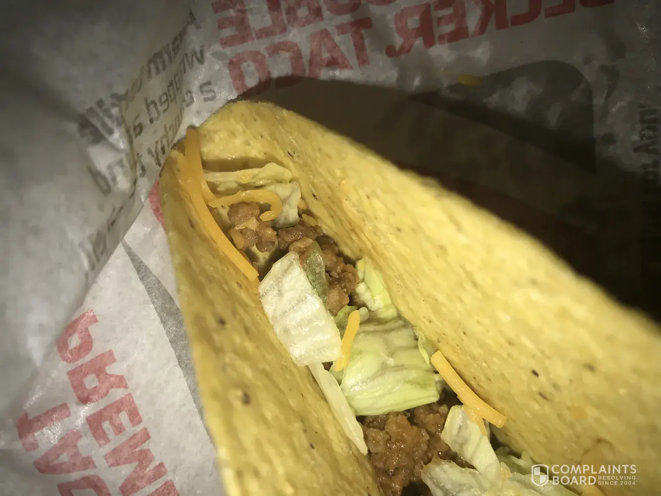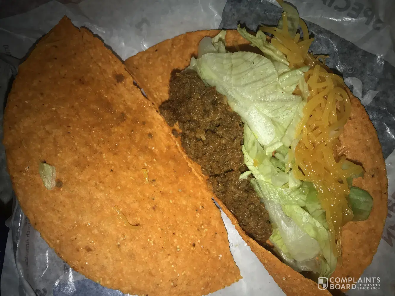 I am submitting this complaint because I have had an on going problem with this specific location. I usually always order crunchy tacos and I just recently moved so I am going to a new Taco Bell and it is absolutely terrible. The tacos are always soggy and most of the time the shells are cracked. Tonight I ordered a taco 12 pack and every single taco was extremely soggy on the bottom & the top of the shell was stale. All of my tacos were cracked and I had to eat them almost with a fork. It was very disappointing and I will never be going back to Taco Bell again.