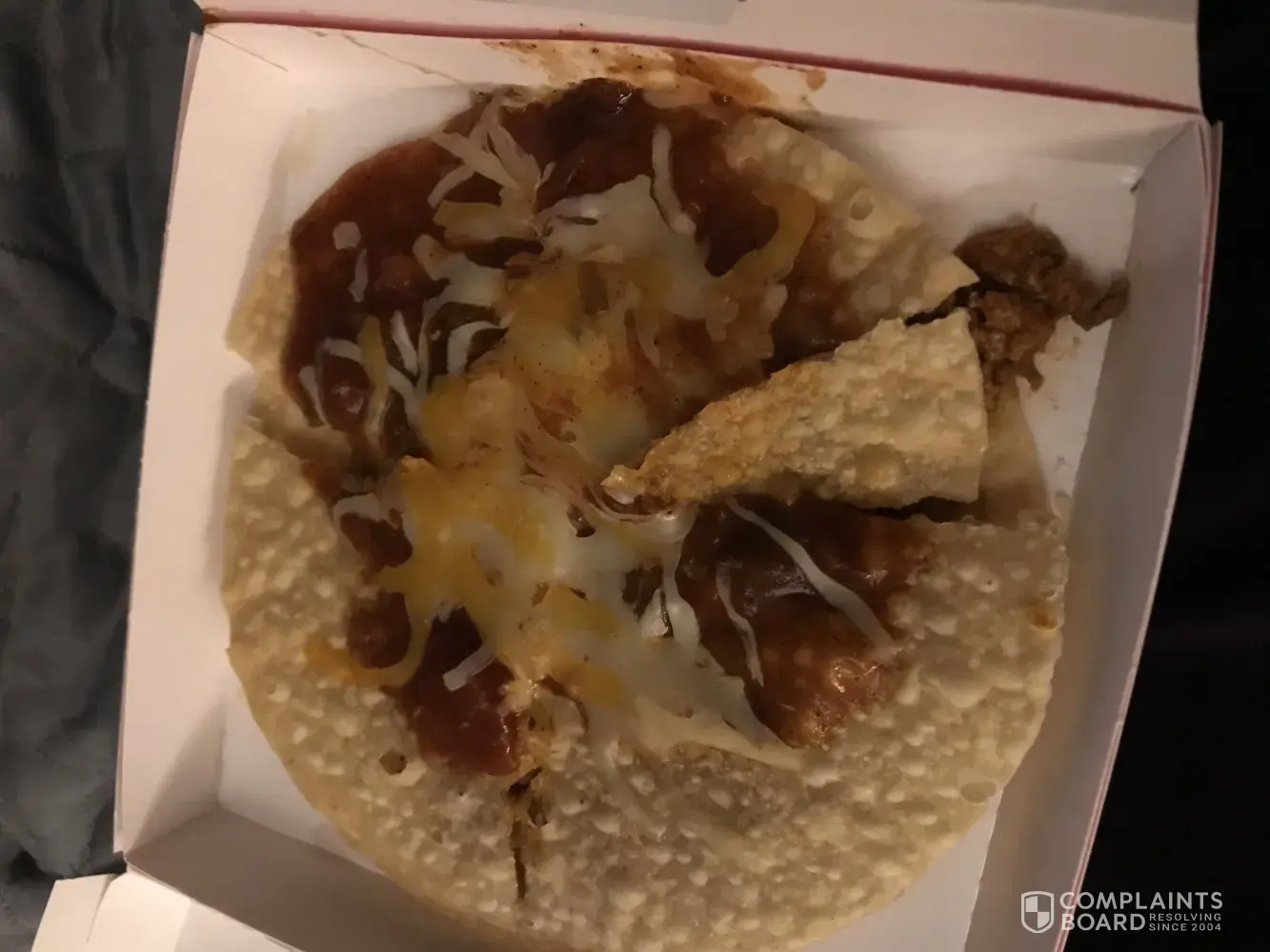 Every time I get a Mexican pizza, the top of box is always smashed don't on to the top of the pizza and all the cheese gets stuck to the top of the lid. Well this time I asked for extra cheese and I got this instead... there is always something wrong at this Taco Bell