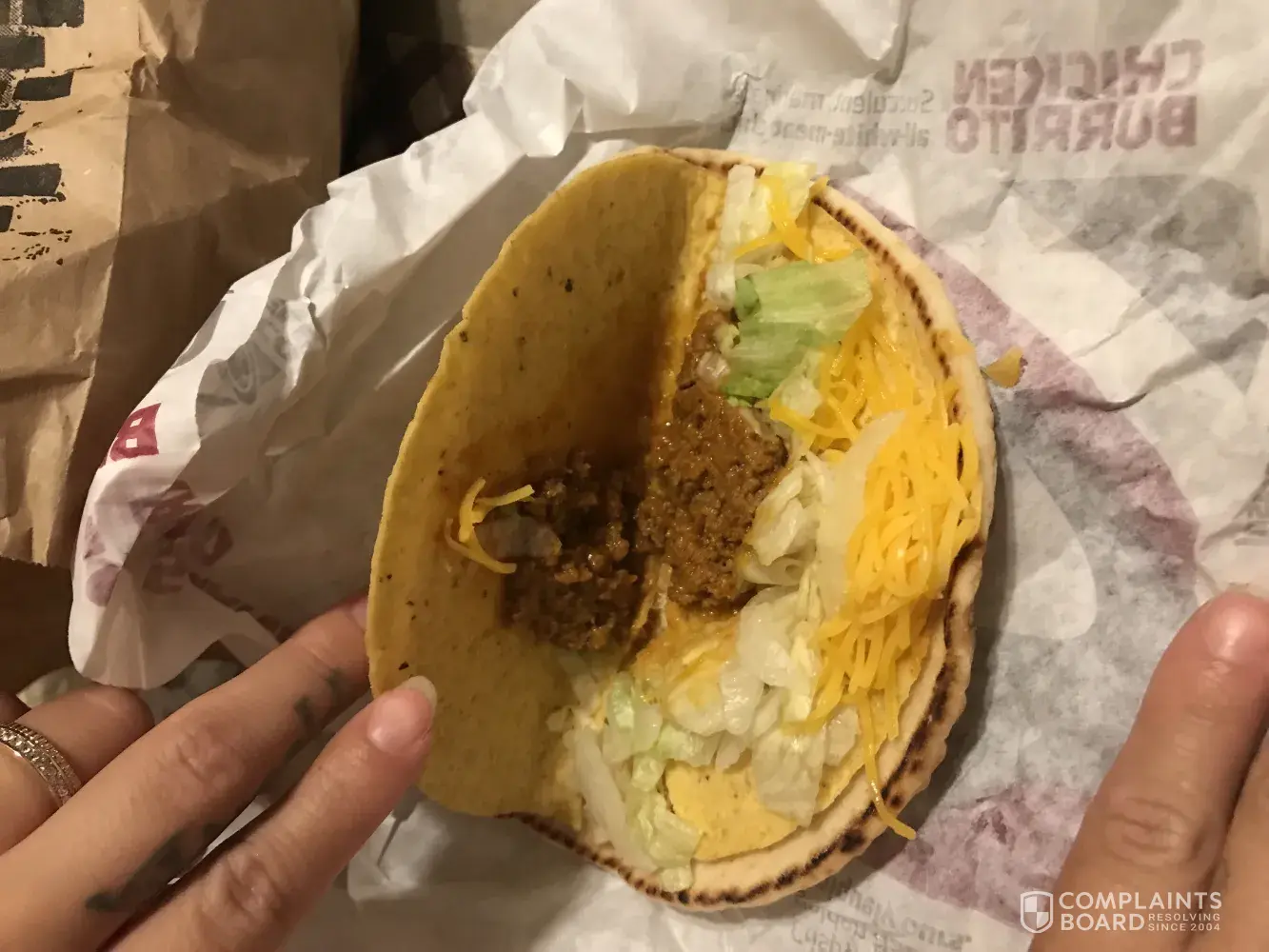 When we got home, the tacos were not crunchy they were soft and sticking to the paper. When we called them they did nothing for us. The Tacos they were cold when we got them out of the box, the service was rude when we called them to tell them that they were soft and not crunchy.