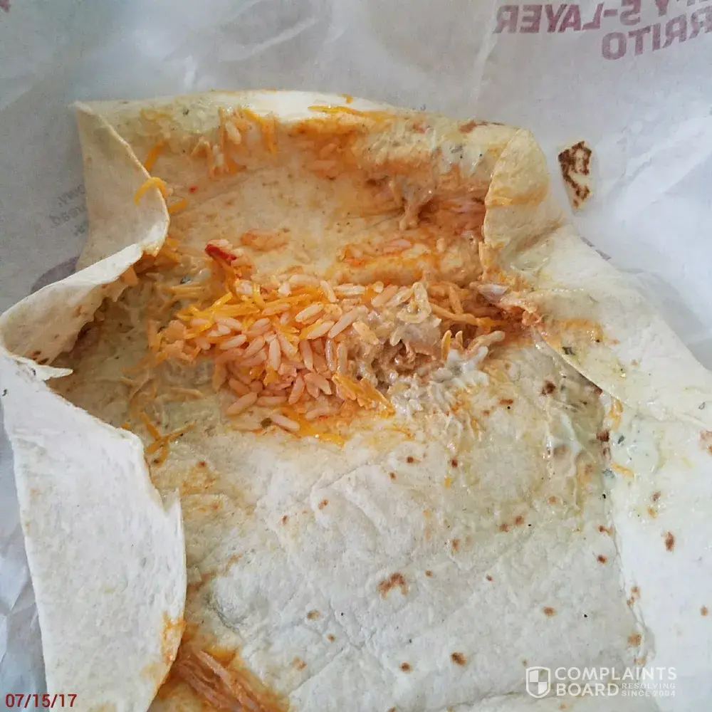 Ordered beef enchirito and received a bean enchirito, no beef at all. Didn't open it until I was at work and couldn't return to Taco Bell. Also could t get different food as I was unable to leave work for 9 hours. Had to eat it or go hungry.