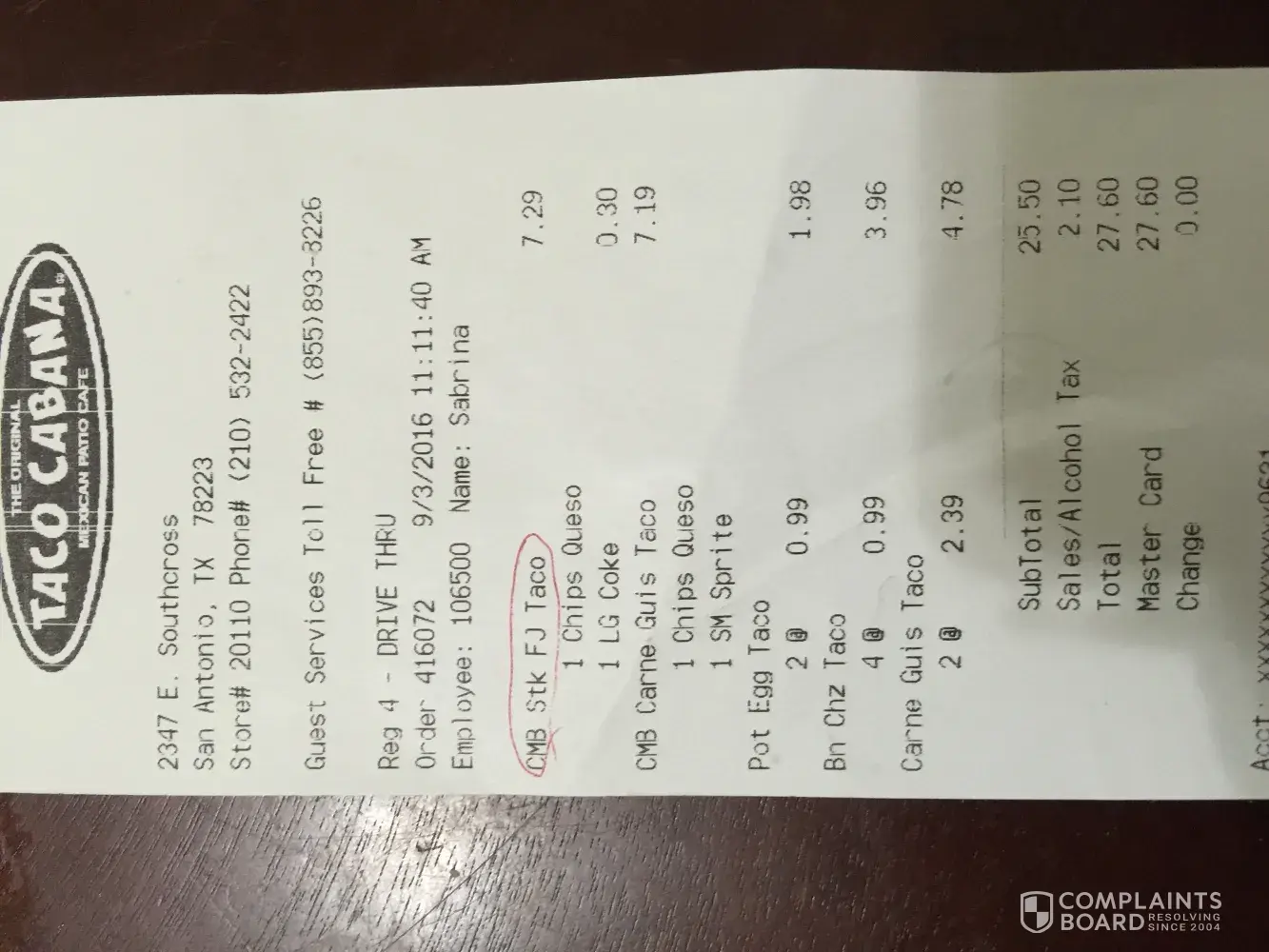 Read full complaintAbout Taco Cabana