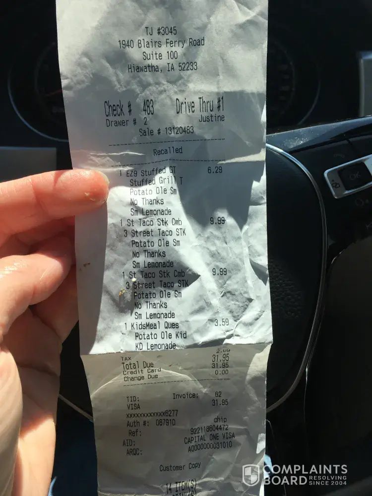 I ordered 2 steak boss bowls. I went threw the drive thru got home there is no steak on them. I don't have my receipt because she didn't give me one. Even though I said yes when she asked if I wanted it. It happened 8/31/2022 at the taco johns in cloquet Minnesota 55720 around 2pm. I paid $16.81. My email is defoe91@gmail.com