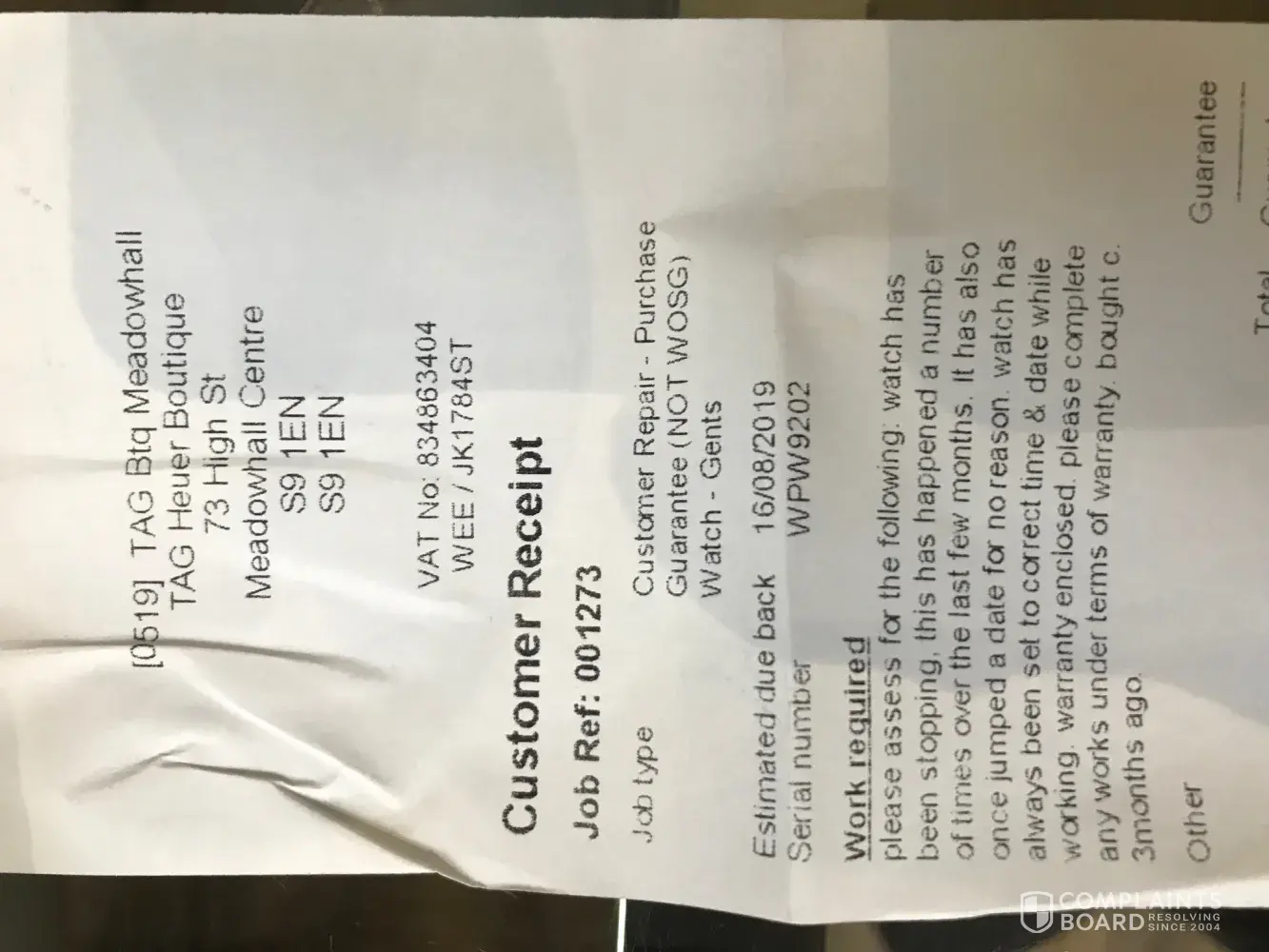 TAG informed the jeweller that the watch had received ‘an impact ‘ and therefore the damage could not be repaired under the guarantee. Please note that I am a 62 year old woman with a quiet lifestyle. I was very upset at the time as it certainly had NOT received an impact but I decided to pay for the repair which was approx £450. You repaired the watch face on the 9th February 2018.