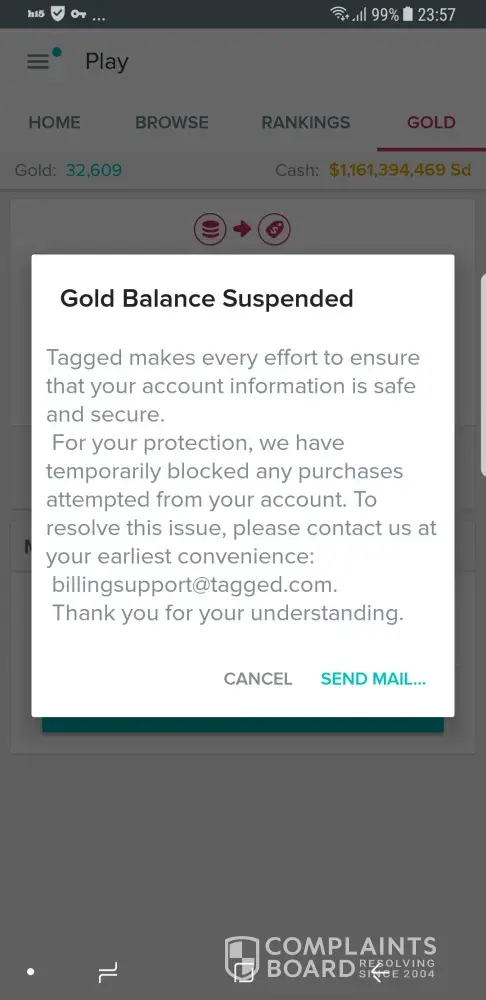 I bought $200.00 in gold, it was paid for and came out of my bank account 05/20/18 TAGGED/HI5 IFWE INC [protected] Debit-$200.00 and tagged says:Gold balance has been temporarily suspended! please fix this so I can use my gold and buy pets, or refund my money back into my bank account.