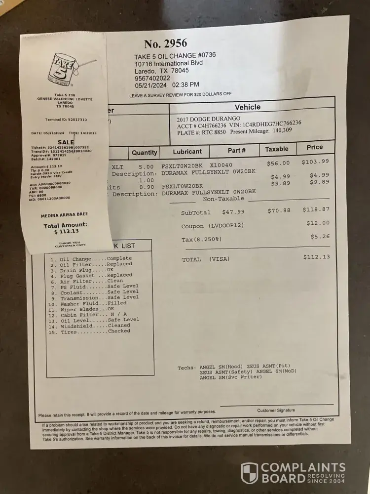 Take 5 Oil Change on Victory Drive: Frustration, Disappointment, and Financial Loss
