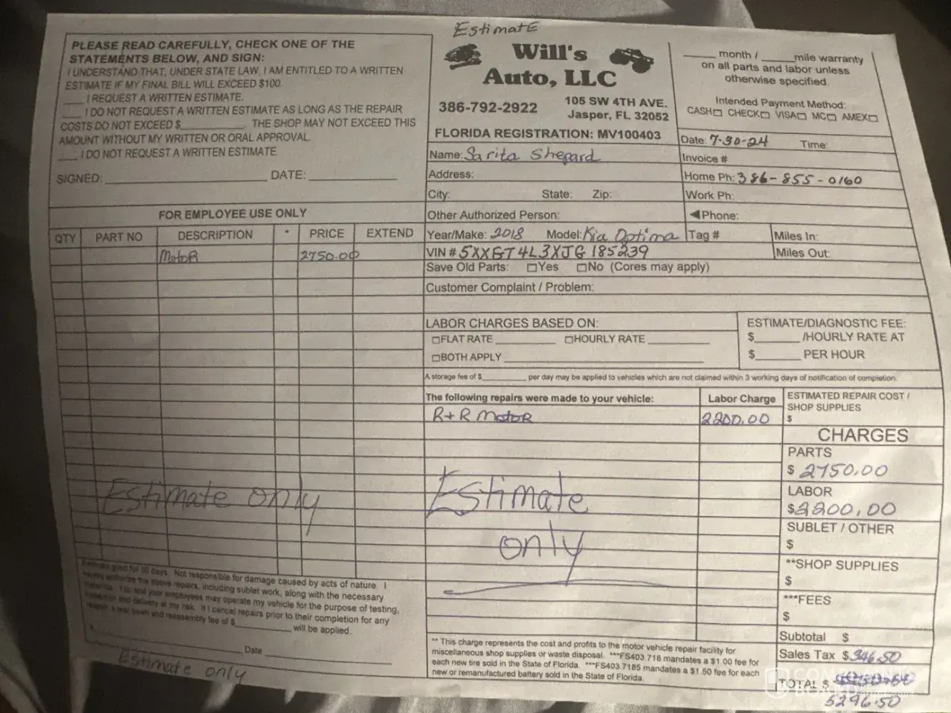 On July 25, 2024 at approximately 8:30am my 2018 Kia optima had service at Take 5 in Live Oak, Fl. On July 26, 2024 at approximately 5:45 am the car started smoking and made a loud noise. I had the car towed to Will’s Auto LLC in Jasper Fl where it was diagnosed to be without oil and a blowed engine.
