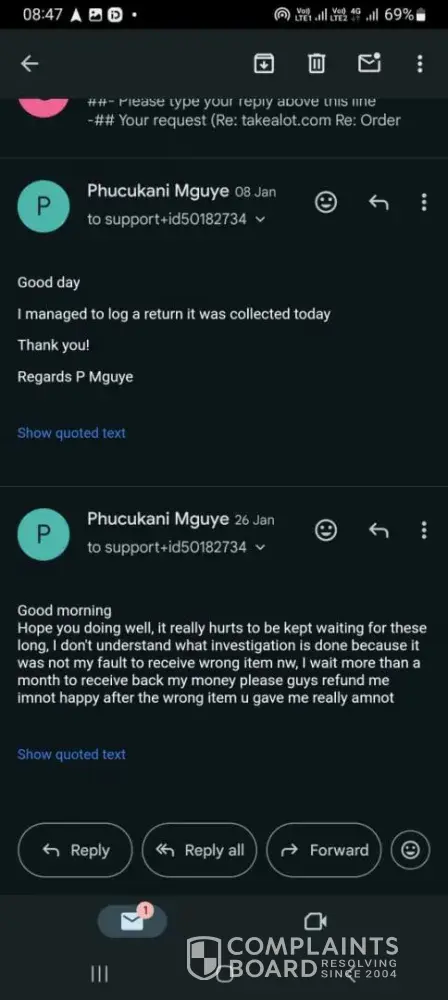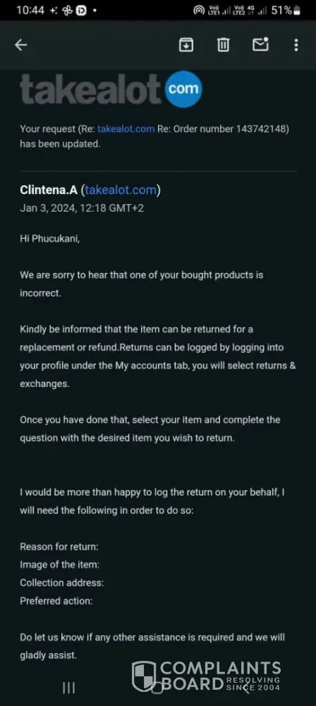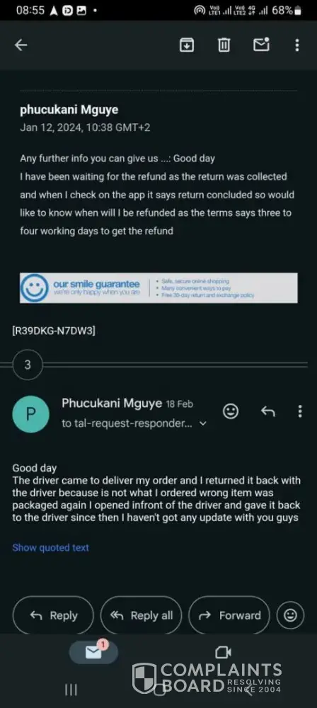 2024/01/08 the driver came to collect the return and I waited for the reply from date of collection till 2024/01/10 I emailed them asking for a feed back from them as I claimed that I want my refund I don't want their product anymore and they replied same day at 09h58 saying I should provide them with order number so that they can assist me.