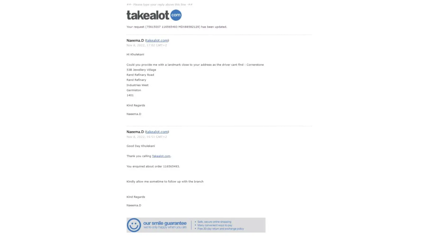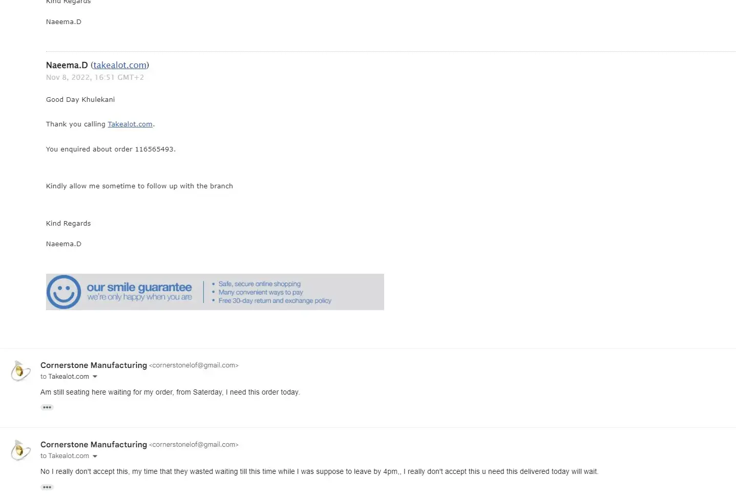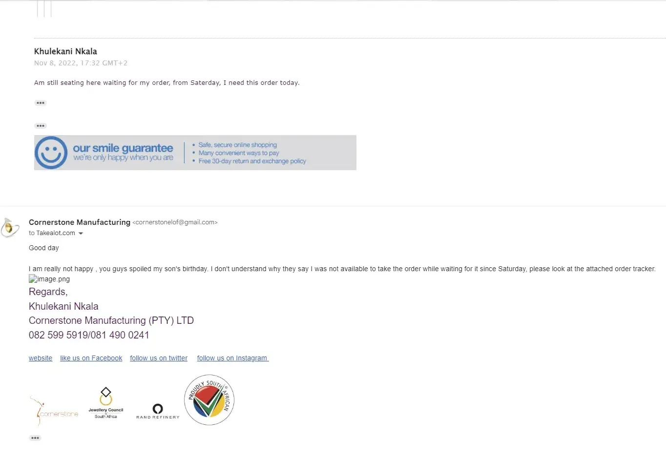 On 23 October 2022 received an email from Samantha.m saying I will escalate your response to our order fullfilment team. That is the last we have heard from takealot.