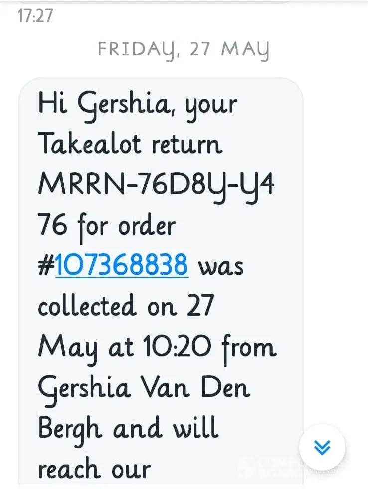 They will deliver the watch I ordered and paid for on 6 June 2022 at no extra cost. 087 362 8000 customer care 087 362 7500 delivery dept. where Xavier J works. I spent hours on phone waiting for someone to answer. ---------- Forwarded message --------- From: Xavier.J (Takealot.com) Date: Tue, 31 May 2022, 17:06 Subject: takealot.com Re: Phone call from: Caller ‪0836111115‬ To: Gershia Van Den Bergh ##- Please type your reply above this line -## Your request (Phone call from: Caller ‪0836111115‬) has been updated. Xavier.J (takealot.com) May 31, 2022, 17:06 GMT+2 Good Day Gershia Thank you for taking my call Kindly be advised as per our telephone conversation We have created a replacement order for you You can track this order using ‪107875826‬ Please be advised, to enhance our quality you will receive a survey shortly, please take a moment to rate my service. If you need any further assistance do not hesitate to contact us. Thank you for shopping with Takealot.com Kind regards Xavier.J Xavier.J (takealot.com) May 31, 2022, 16:21 GMT+2 Good day Gershia Thank you for contacting Takealot. Kindly be advised I will be contacting The relevant department with regards to your Takealot order Once I get a response from them I will revert back to you Should you have any further questions please do not hesitate to contact us Kind Regards Xavier.J [ZQ7VOP-XVZQD]