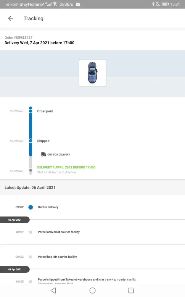 Thu 2021/04/01 10:08 Your Takealot order 85927915 has been collected at the Pretoria North Pickup Point on Thursday, 1 April 2021 at 10h06.