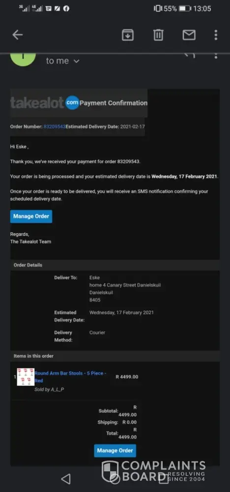 my reply..Apr 9, 2021, 13:37. Monday is going to difficult monday iam back at work and here is nobody to do the collection. If possible if the package to be delivered to Takealot pickup point at wonderboom junction i will the do the pickup there