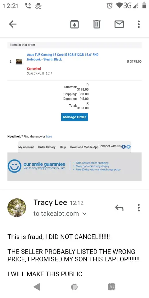 Paid for 2 laptops, confirmed. Then I get an email saying I cancelled the order. The laptops, both were r 3200 together. And when I checked again they are listed as r17000 and more each! That rand they made a mistake now my son doesn't get what he wanted. That's fraud