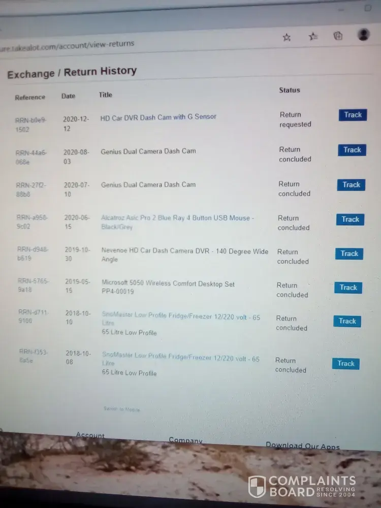 In the last two years, I have purchased eight items from takealot and out of the eight items, I have returned eight items as the pictures of the items purchased and the items that were delivered are definitely not the same. I have attached a screen shot of the returns done in the past two years. The last item purchased was a dashcam which I have been searching for for a long time as I have had that same dashcam for the last six or seven years but it has finally given up now. The camera that that I received is totally different to the one advertised and that was the one that I have been searching for. I am really fed up with this attitude of theirs whereby they say that they are not the suppliers, they only distribute the items, well... They should be checking that the item picture and the item that they are about to "distribute" are the same thing. Very, very disappointed with the takealot service, or lack of service.