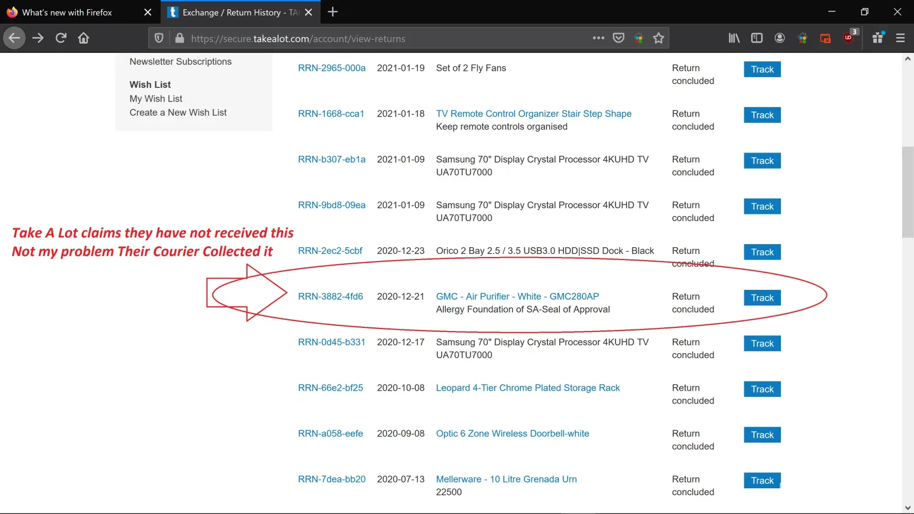 I ordered a GMC Air Purifier for R2, 799.00 in December After testing the device it did not meet my satisfaction and I logged a return the same day. 2 weeks Later it was collected by an appointed Courier company utilized by Take A Lot I asked the drive who collected the Air Purifier for a receipt to which he replied we do dot issue receipts and proceeded to stick a bar code sticker on the cooler as well as a Hard drive chassis I was also returning. The hard drive was refunded back into my account but not the cooler. I have been trying since early January to get my refund and each time I am given a different story by 5 different staff at Take a Lot ( namely