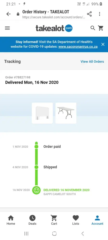 Goods I ordered from Takealot had a delivery due date of 27/11/2020. I track my Takealot deliveries via the Takealot app.